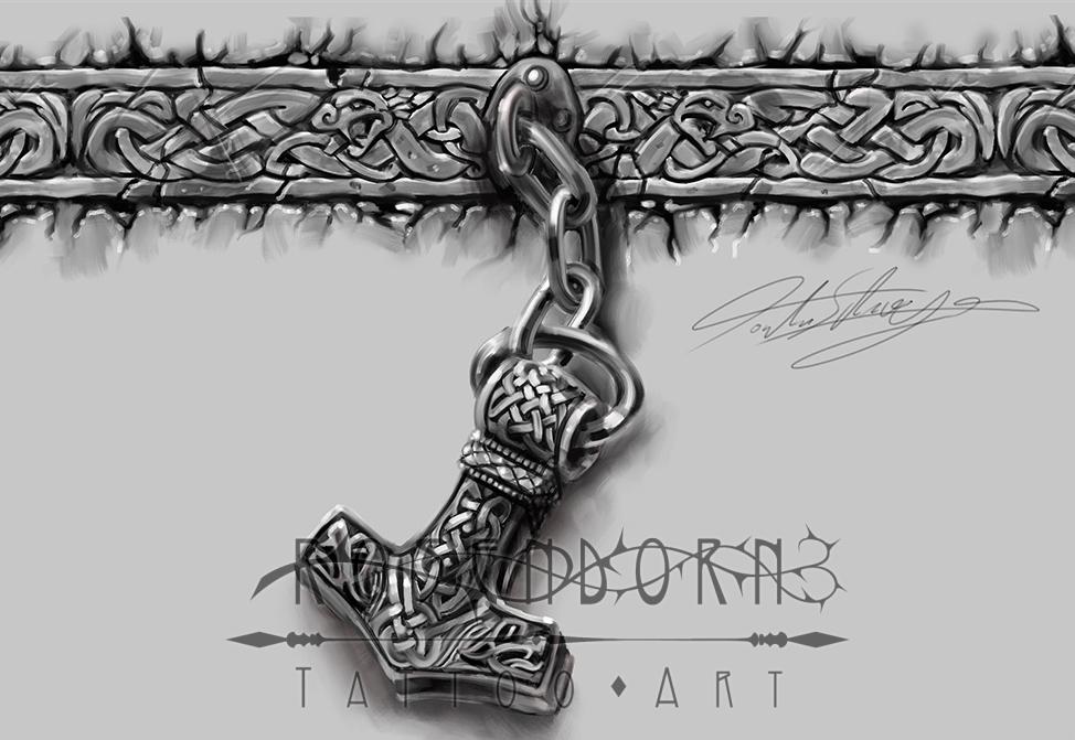 Thor persönlich würde sich über dieses Tattoo freuen, zeigt es doch seinen berühmten Hammerschmuck in einem neuen Licht. Ein „eingestanzt” wirkendes Armband im nordgermanischen Tierstil, an welches Mjölnir mittels einer geschmiedeten Eisenkette befestigt ist. Das Motiv wurde in zwei Sessions gestochen, daher der Kontrastunterschied zwischen der oberen und der unteren Hälfte. Blutige Erweiterungen sind in Planung.